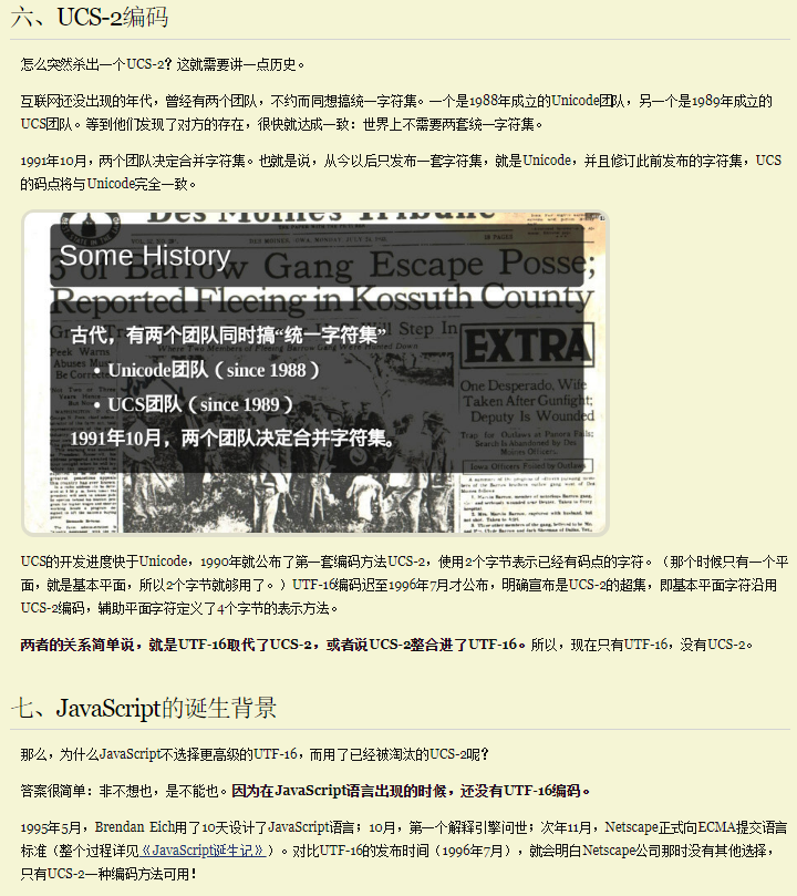 JS 引擎可以选择使用 UCS-2 或者 UTF-16,为什么不用UTF-8历史原因,我把阮老师的文章截图放在这里,可以供大家了解: