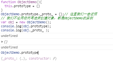 // 比如,我们的ObjectDemo是我们创建对象的工厂函数 function ObjectDemo(){ this.protoType = {} } ObjectDemo.prototype._proto_ = {};// 这里我们一会说明 // 我们不论用任何写法来创建对象,都是ObjectDemo的实例 var obj = new ObjectDemo(); console.log(obj.prototype); // undefined console.log(obj._proto_ ); // {}