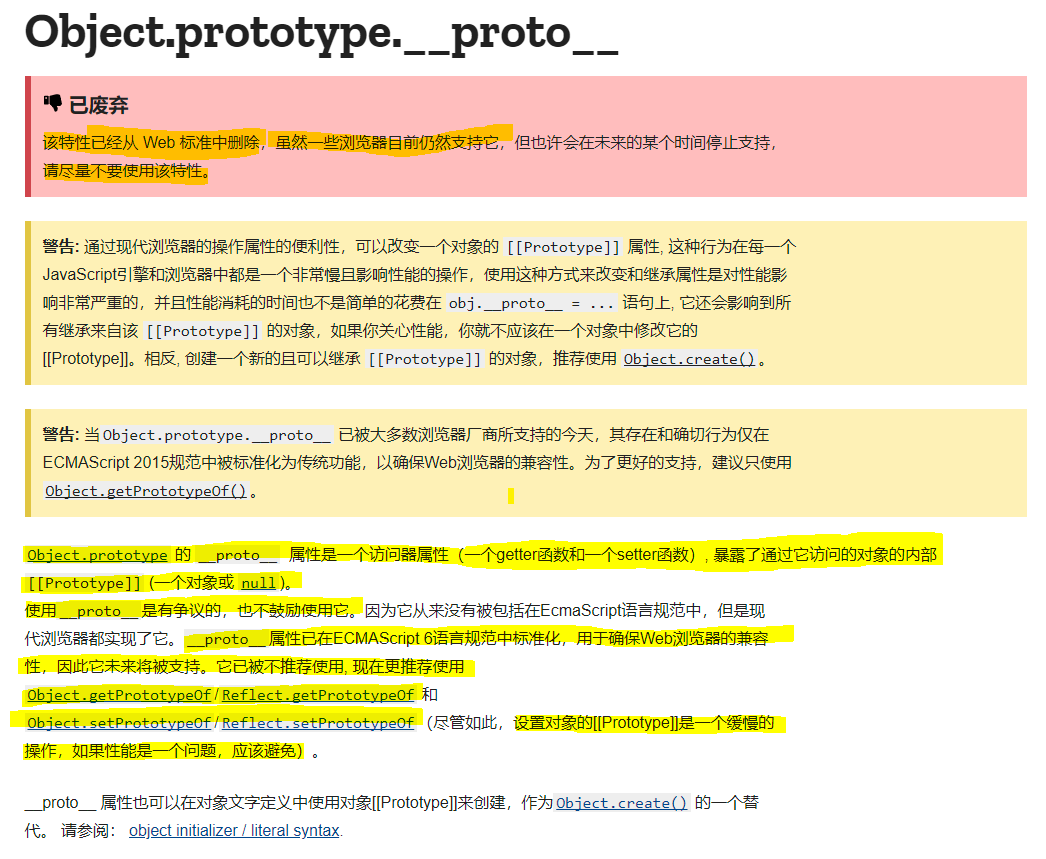 但是由于这个属性太过疯狂,所以已经被Web 标准中删除,即使浏览器目前还在支持,但是以后应该也不会支持了,目前更推荐Object.getPrototypeOf/Reflect.getPrototypeOf 和Object.setPrototypeOf/Reflect.setPrototypeOf
