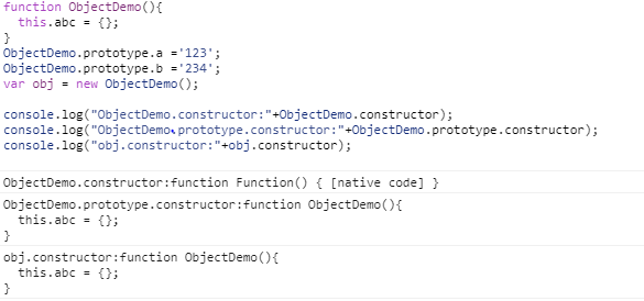 function ObjectDemo(){ this.abc = {}; } ObjectDemo.prototype.a ='123'; ObjectDemo.prototype.b ='234'; var obj = new ObjectDemo(); console.log("ObjectDemo.constructor:"+ObjectDemo.constructor); console.log("ObjectDemo.prototype.constructor:"+ObjectDemo.prototype.constructor); console.log("obj.constructor:"+obj.constructor);// 输出ObjectDemo.constructor:function Function() { [native code] }ObjectDemo.prototype.constructor:function ObjectDemo(){ this.abc = {};} obj.constructor:function ObjectDemo(){this.abc = {};}