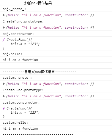 function newObjFun(objTemp){ // 之前文章说过,new运算之后还是返回一个对象,那我们就首先建一个对象 var tempObject ={}; // 自动引用好的prototype // tempObject._proto_ = objTemp.prototype; 目前已经不赞成直接使用_proto_属性去修改原型了,因此我们使用Object.setPrototypeOf()方法 Object.setPrototypeOf(tempObject, objTemp.prototype); //最终我们要返回这个对象 return tempObject; } //这是我们的构造函数 function CreateFunc(){ this.a = "123"; } CreateFunc.prototype.hello = "hi i am a function" var obj = new CreateFunc(); //这是js的new操作的结果 console.log("-----------js的new操作结果-----------"); console.log("obj._proto_:"); console.log(Object.getPrototypeOf(obj)); console.log("CreateFunc.prototype:"); console.log(CreateFunc.prototype); console.log("obj.constructor:"); console.log(obj.constructor); console.log("obj.hello:"); console.log(obj.hello); console.log("------------------------------------"); var custom = newObjFun(CreateFunc); //这是js的new操作的结果 console.log("-----------自定义new操作结果-----------"); console.log("custom._proto_:"); console.log(Object.getPrototypeOf(custom)); console.log("CreateFunc.prototype:"); console.log(CreateFunc.prototype); console.log("custom.constructor:"); console.log(custom.constructor); console.log("custom.hello:"); console.log(custom.hello); console.log("------------------------------------");