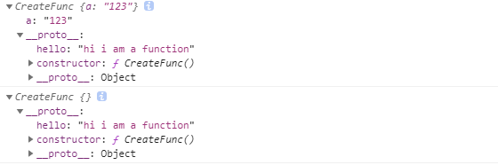 运行结果,看出来了,我们成功了,我们让tempObject 指向了CreateFunc这个构造函数,同时,我们也继承了CreateFunc的原型