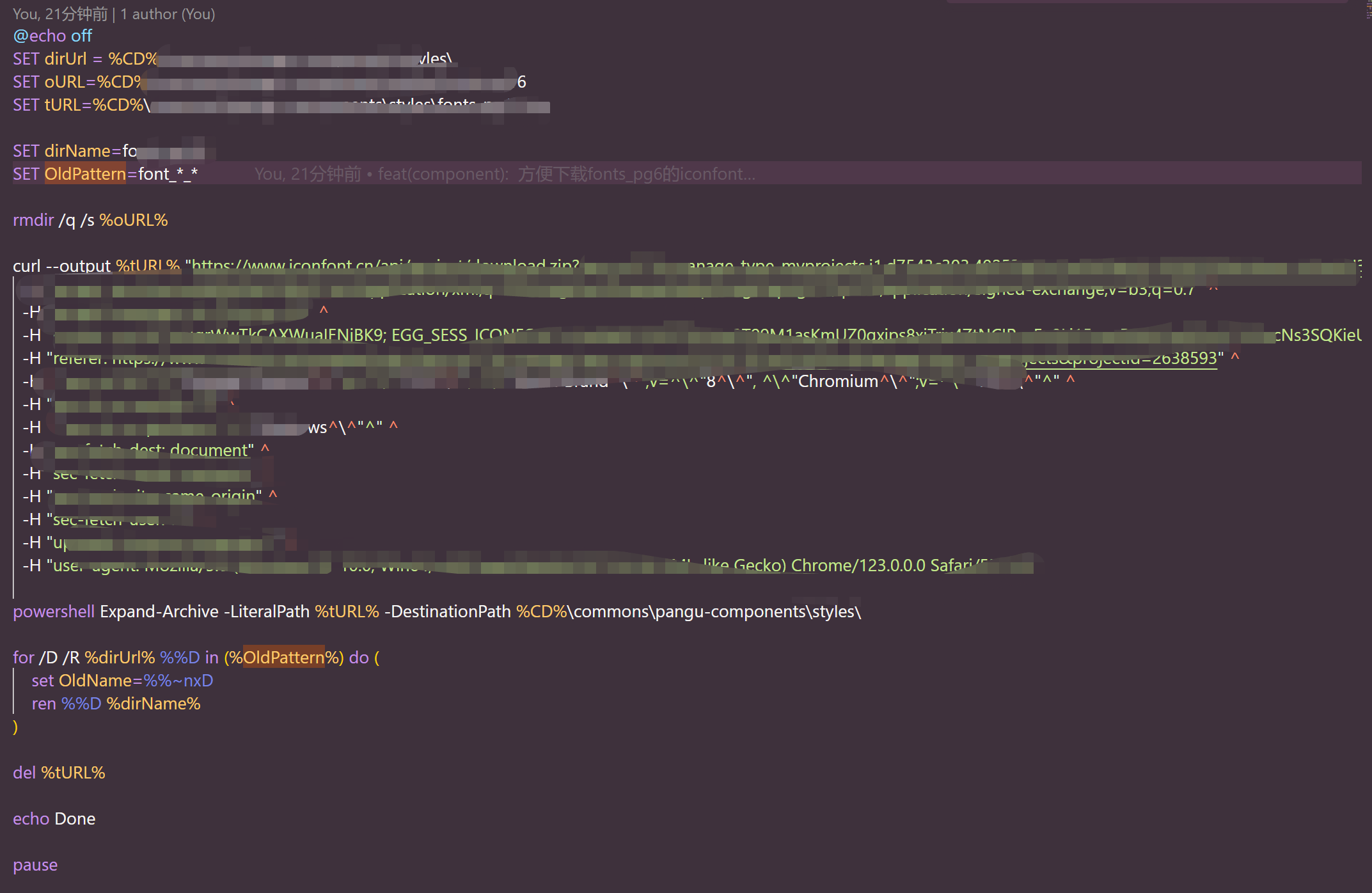 @echo off SET dirName=替换成压缩包解压后希望叫的名字 SET OldPattern=font_*_* rmdir /q /s "删除原来的iconfont文件夹,这里替换成原来的文件夹的地址" curl --output %这里的地址是你想把从iconfont上下载下来的安装包放在哪个文件下得的地址% "这里替换成上面截图的信息" powershell Expand-Archive -LiteralPath 替换成下载的iconfont压缩包的位置 -DestinationPath 替换成压缩包解压的位置 for /D /R %dirUrl% %%D in (%OldPattern%) do ( set OldName=%%~nxD ren %%D %dirName% ) del 替换成压缩包的位置 echo Done pause