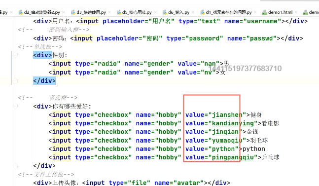 12.input 标签里面,要写value属性,用于接收用户选择的数据,传递给后端----单选和多选框要value