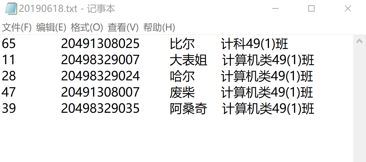 #include<fstream> #include <string> #include <cstdlib> #include<sstream> #include<ctime> #include "utils.h" using namespace std; int main() { ifstream fin; ofstream fout; string filename1; int num, totalline = 0; cout << "输入名单列表文件名:"; cin >> filename1; cout << "输入随机抽点人数:"; cin >> num; fin.open(filename1, ios_base::in); if (!fin.is_open()) { cerr << "fail to open file " << filename1 << endl; system("pause"); exit(0); } string temp; string a[100]; if (fin) { while (getline(fin, temp)) { a[totalline++] = temp; } fin.close(); } string filename; filename = getCurrentDate()+".txt"; cout << "new file name is "<<filename << endl; srand(std::time(0)); for (int i = 0;i < num;i++) { int line; int random = rand(); line = rand()%totalline ; cout << a[line] << endl; fout.open(filename, ios_base::app); fout << a[line] << endl; fout.close(); } system("pause"); return 0; } utils.h #include <string> using std::string; string getCurrentDate(); utils.cpp #include "utils.h" #include <ctime> using std::string; const int SIZE = 20; string getCurrentDate() { time_t time_seconds = time(0); struct tm now_time; localtime_s(&now_time, &time_seconds); char date[SIZE]; strftime(date, SIZE, "%Y%m%d", &now_time); return (string(date))