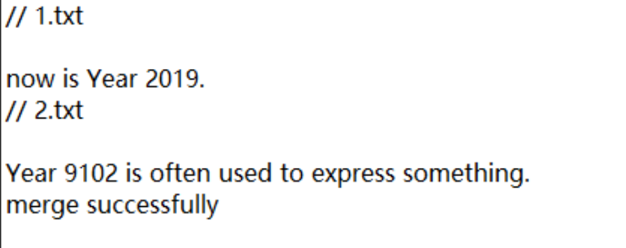 #include <iostream> #include <fstream> #include <string> #include <cstdlib> using namespace std; int main() { char filename1[10], filename2[10], newfilename[10]; cout << "输入要合并的两个文件名: " ; gets(filename1); gets(filename2); cout << "输入合并后新文件名: " ; cin >> newfilename; ofstream fout; ifstream fin; fin.open(filename1); if(!fin.is_open()) { cerr << "fail to open file " << filename1 << endl; system("pause"); exit(0); } fout.open(newfilename); if(!fin.is_open()) { cerr << "fail to open file " << newfilename << endl; system("pause"); exit(0); } char ch; while(fin.get(ch)) fout << ch; fin.close(); fout << endl; fin.open(filename2); if(!fin.is_open()) { cerr << "fail to open file " << filename2 << endl; system("pause"); exit(0); } while(fin.get(ch)) fout << ch; fin.close(); fout<<"\nmerge successfully."<<endl; fout.close(); system("pause"); return 0; }