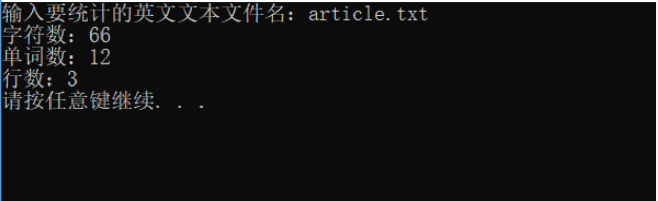 #include<iostream> #include<fstream> #include<string> using namespace std; int main() { string fn,temp; char tch; ifstream fin; int charcnt,wordcnt,linecnt; cout<<"输入要统计的英文文本文件名:"; cin>>fn; fin.open(fn); if(!fin.is_open()) { cerr << "fail to open file"<<fn<< endl; system("pause"); exit(0); } charcnt = 0; while(fin.get(tch)) charcnt++; charcnt--; wordcnt=0; fin.close(); fin.open(fn); while(fin>>temp) wordcnt++; linecnt=0; fin.close(); fin.open(fn) ; while(getline(fin,temp)) linecnt++; fin.close(); cout<<"字符数:"<<charcnt<<endl; cout<<"单词数:"<<wordcnt<<endl; cout<<"行数:"<<linecnt<<endl; system("pause"); return 0; }