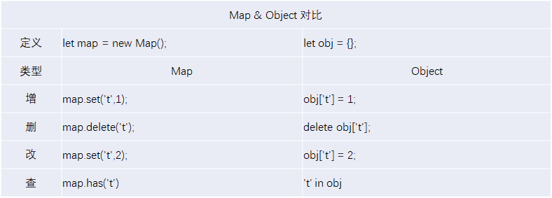 2)Map : JavaScript的对象(Object),本质上是键值对的集合(Hash结构),但是传统上只能用字符串当作键。为了解决这个问题,ES6提供了Map数据结构。它类似于对象,也是键值对的集合,但是“键”的范围不限于字符串,各种类型的值(包括对象)都可以当作键。也就是说,Object结构提供了“字符串—值”的对应,Map结构提供了“值—值”的对应,是一种更完善的Hash结构实现。