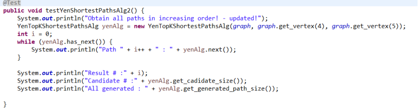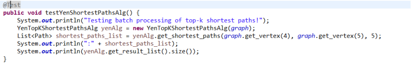 /** * Note that, the source should not be as same as the sink! (we could extend * this later on) * * @param source_vertex 起点 * @param sink_vertex 终点 * @return */ public Path get_shortest_path(BaseVertex source_vertex, BaseVertex sink_vertex) /** * Get the top-K shortest paths connecting the source and the target. This * is a batch execution of top-K results. * * @param source 起点 * @param sink 终点 * @param top_k路线数量 * @return */ public List<Path> get_shortest_paths(BaseVertex source_vertex, BaseVertex target_vertex, int top_k)