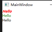 //资源字典文件 <ResourceDictionary xmlns="http://schemas.microsoft.com/winfx/2006/xaml/presentation" xmlns:x="http://schemas.microsoft.com/winfx/2006/xaml"> <Style TargetType="TextBlock" > <Setter Property="FontStyle" Value="Italic"/> <Setter Property="FontWeight" Value="Bold"/> </Style> <Style x:Key="textBlockStyleGreen" TargetType="TextBlock" BasedOn="{StaticResource {x:Type TextBlock}}"> <Setter Property="Foreground" Value="Green"/> </Style> <Style x:Key="textBlockStyleRed" TargetType="TextBlock" > <Setter Property="Foreground" Value="Red"/> </Style> </ResourceDictionary> <Window x:Class="WpfApp_Test.MainWindow" xmlns="http://schemas.microsoft.com/winfx/2006/xaml/presentation" xmlns:x="http://schemas.microsoft.com/winfx/2006/xaml" xmlns:d="http://schemas.microsoft.com/expression/blend/2008" xmlns:mc="http://schemas.openxmlformats.org/markup-compatibility/2006" xmlns:local="clr-namespace:WpfApp_Test" mc:Ignorable="d" Title="MainWindow" Height="240" Width="300"> <StackPanel> <TextBlock Text="Hello"/> <TextBlock Text="Hello" Style="{StaticResource textBlockStyleGreen}"/> <TextBlock Text="Hello" Style="{StaticResource textBlockStyleRed}"/> </StackPanel> </Window>