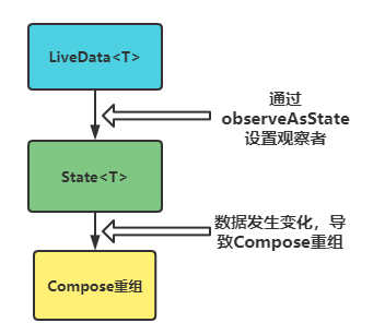 在上面的图中,当通过observeAsState()方法给LiveData设置观察者时,该方法会通过State对象来代表它的新值,然后当数据State发生变化时,在Compose中使用到State的地方就会发生重组。
