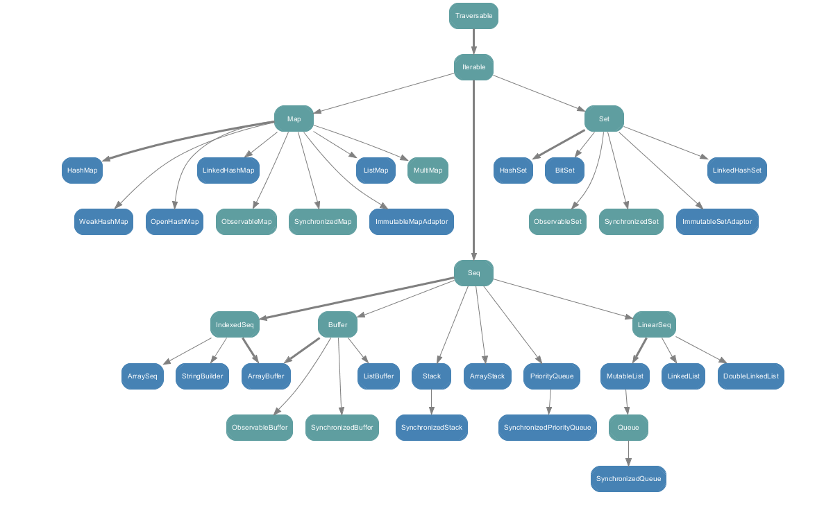 3. Scala 集合有三大类,序列Seq(有序,Linear Seq)、集Set、映射Map[Key->Value],所有集合继承扩展自Iterable。