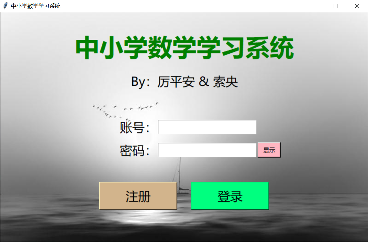 class LogIn: """ 登录界面类 """ def __init__(self, parent_window): self.window = parent_window self.window.title('中小学数学学习系统') self.frame = tk.Frame(self.window) self.frame.place(x=0, y=0, width=800, height=500) self.frame.focus_set() self.bg_photo = tk.PhotoImage(file=PHOTO_PATH) self.canvas = tk.Canvas(self.frame, width=800, height=500, highlightthickness=0, borderwidth=0) self.canvas.place(x=0, y=0) self.canvas.create_image(0, 0, anchor='nw', image=self.bg_photo) self.canvas.create_text(400, 75, text='中小学数学学习系统', font=('微软雅黑', 40, 'bold'), fill='green') self.canvas.create_text(400, 150, text='By:厉平安 & 索央', font=('微软雅黑', 20)) self.tip_label = self.canvas.create_text( 400, 200, text='', font=('微软雅黑', 15, 'bold'), fill='red') self.canvas.create_text(300, 250, text='账号:', font=('微软雅黑', 20)) self.id_entry = tk.Entry(self.frame, font=('宋体', 20), relief='groove', width=15) self.id_entry.place(x=450, y=250, anchor=tk.CENTER) self.canvas.create_text(300, 300, text='密码:', font=('微软雅黑', 20)) self.pwd_entry = tk.Entry(self.frame, font=('宋体', 20), width=15, show='*') self.pwd_entry.place(x=450, y=300, anchor=tk.CENTER) self.show_button = tk.Button(self.frame, text="显示", font=('微软雅黑', 10), width=5, height=1, command=self.show_change, fg='black', bg='lightpink', activebackground='pink', activeforeground='black') self.show_button.place(x=585, y=300, anchor=tk.CENTER) sign_button = tk.Button(self.frame, text="注册", font=('微软雅黑', 20), width=10, height=1, command=self.sign_in, fg='black', bg='tan', activebackground='pink', activeforeground='black') sign_button.place(x=300, y=400, anchor=tk.CENTER) log_button = tk.Button(self.frame, text="登录", font=('微软雅黑', 20), width=10, height=1, command=self.log_in, fg='black', bg='springgreen', activebackground='pink', activeforeground='black') log_button.place(x=500, y=400, anchor=tk.CENTER) self.window.bind("<Return>", self.log_in) # 绑定响应 self.id_entry.focus_set() # 设置聚焦 self.window.mainloop() def show_change(self): if self.pwd_entry['show'] == '*': self.pwd_entry['show'] = '' self.show_button['text'] = '不显示' else: self.pwd_entry['show'] = '*' self.show_button['text'] = '显示'
