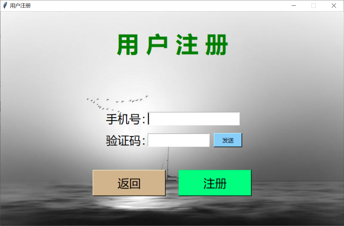 class SignIn: """ 注册页面 """ def __init__(self, parent_window): self.window = parent_window self.window.title('用户注册') self.phone_number = '' # 手机号,也是用户唯一id self.verification = cc.new_verification() # 新建验证码 self.frame = tk.Frame(self.window) self.frame.place(x=0, y=0, width=800, height=500) self.frame.focus_set() self.bg_photo = tk.PhotoImage(file=PHOTO_PATH) self.canvas = tk.Canvas(self.frame, width=800, height=500, highlightthickness=0, borderwidth=0) self.canvas.place(x=0, y=0) self.canvas.create_image(0, 0, anchor='nw', image=self.bg_photo) self.canvas.create_text(400, 75, text='用 户 注 册', font=('微软雅黑', 40, 'bold'), fill='green') # tip_label用于提示错误信息 self.tip_label = self.canvas.create_text( 400, 200, text='', font=('微软雅黑', 15, 'bold'), fill='red') self.canvas.create_text(300, 250, text='手机号:', font=('微软雅黑', 20)) self.phone_entry = tk.Entry(self.frame, font=('宋体', 20), relief='groove', width=15) self.phone_entry.place(x=450, y=250, anchor=tk.CENTER) self.canvas.create_text(300, 300, text='验证码:', font=('微软雅黑', 20)) self.code_entry = tk.Entry(self.frame, font=('宋体', 20), width=10) self.code_entry.place(x=415, y=300, anchor=tk.CENTER) self.code_button = tk.Button(self.frame, text='发送', font=('微软雅黑', 10), width=7, height=1, command=self.send_code, fg='black', bg='lightskyblue', activebackground='pink', activeforeground='black') self.code_button.place(x=530, y=300, anchor=tk.CENTER) return_button = tk.Button(self.frame, text="返回", font=('微软雅黑', 20), width=10, height=1, command=lambda: LogIn(self.window), fg='black', bg='tan', activebackground='pink', activeforeground='black') return_button.place(x=300, y=400, anchor=tk.CENTER) log_button = tk.Button(self.frame, text="注册", font=('微软雅黑', 20), width=10, height=1, command=self.log_change_pwd, fg='black', bg='springgreen', activebackground='pink', activeforeground='black') log_button.place(x=500, y=400, anchor=tk.CENTER) self.window.bind("<Return>", self.log_change_pwd) # 绑定响应 self.phone_entry.focus_set() self.window.mainloop()