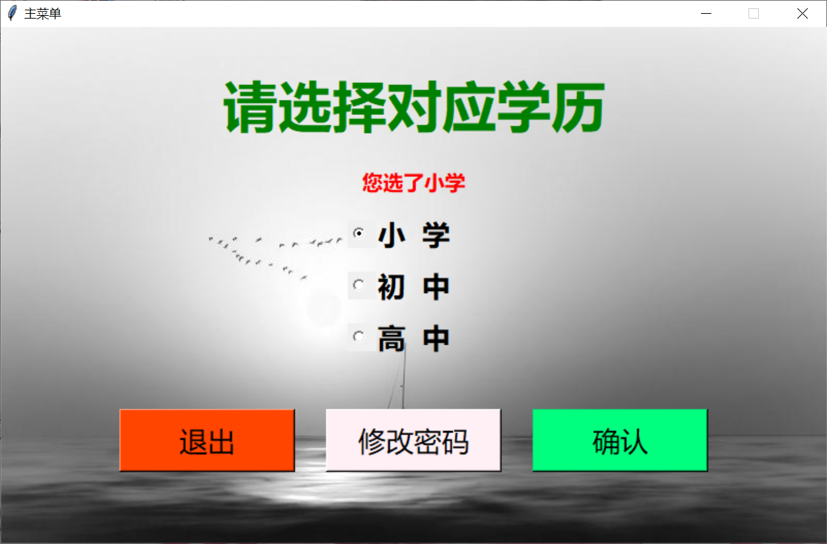 class MainMenu: """ 主菜单:包括修改密码和选择学历 """ def __init__(self, parent_window, user_id): # 包括传输的密码和账号 self.user_id = user_id self.window = parent_window self.window.title('主菜单') self.frame = tk.Frame(self.window) self.frame.place(x=0, y=0, width=800, height=500) self.frame.focus_set() self.bg_photo = tk.PhotoImage(file=PHOTO_PATH) self.canvas = tk.Canvas(self.frame, width=800, height=500, highlightthickness=0, borderwidth=0) self.canvas.place(x=0, y=0) self.canvas.create_image(0, 0, anchor='nw', image=self.bg_photo) self.canvas.create_text(400, 75, text='请选择对应学历', font=('微软雅黑', 40, 'bold'), fill='green') self.tip_label = self.canvas.create_text( 400, 150, text='您选了小学', font=('微软雅黑', 15, 'bold'), fill='red') self.var = tk.IntVar() # 单选框变量 rd1 = tk.Radiobutton(self.frame, variable=self.var, value=1, command=self.select_dis) rd1.place(x=350, y=200, anchor=tk.CENTER) self.canvas.create_text(400, 200, text='小 学', font=('微软雅黑', 20, 'bold')) rd2 = tk.Radiobutton(self.frame, variable=self.var, value=2, command=self.select_dis) rd2.place(x=350, y=250, anchor=tk.CENTER) self.canvas.create_text(400, 250, text='初 中', font=('微软雅黑', 20, 'bold')) rd3 = tk.Radiobutton(self.frame, variable=self.var, value=3, command=self.select_dis) rd3.place(x=350, y=300, anchor=tk.CENTER) self.canvas.create_text(400, 300, text='高 中', font=('微软雅黑', 20, 'bold')) self.var.set(1) return_button = tk.Button(self.frame, text="退出", font=('微软雅黑', 20), width=10, height=1, command=lambda: LogIn(self.window), fg='black', bg='orangered', activebackground='pink', activeforeground='black') return_button.place(x=200, y=400, anchor=tk.CENTER) change_button = tk.Button(self.frame, text="修改密码", font=('微软雅黑', 20), width=10, height=1, fg='black', bg='LavenderBlush', command=self.change_pwd, activebackground='pink', activeforeground='black') change_button.place(x=400, y=400, anchor=tk.CENTER) confirm_button = tk.Button(self.frame, text="确认", font=('微软雅黑', 20), width=10, height=1, fg='black', bg='springgreen', command=self.test_number, activebackground='pink', activeforeground='black') confirm_button.place(x=600, y=400, anchor=tk.CENTER) self.window.bind("<Return>", self.test_number) # 绑定响应 self.window.mainloop()