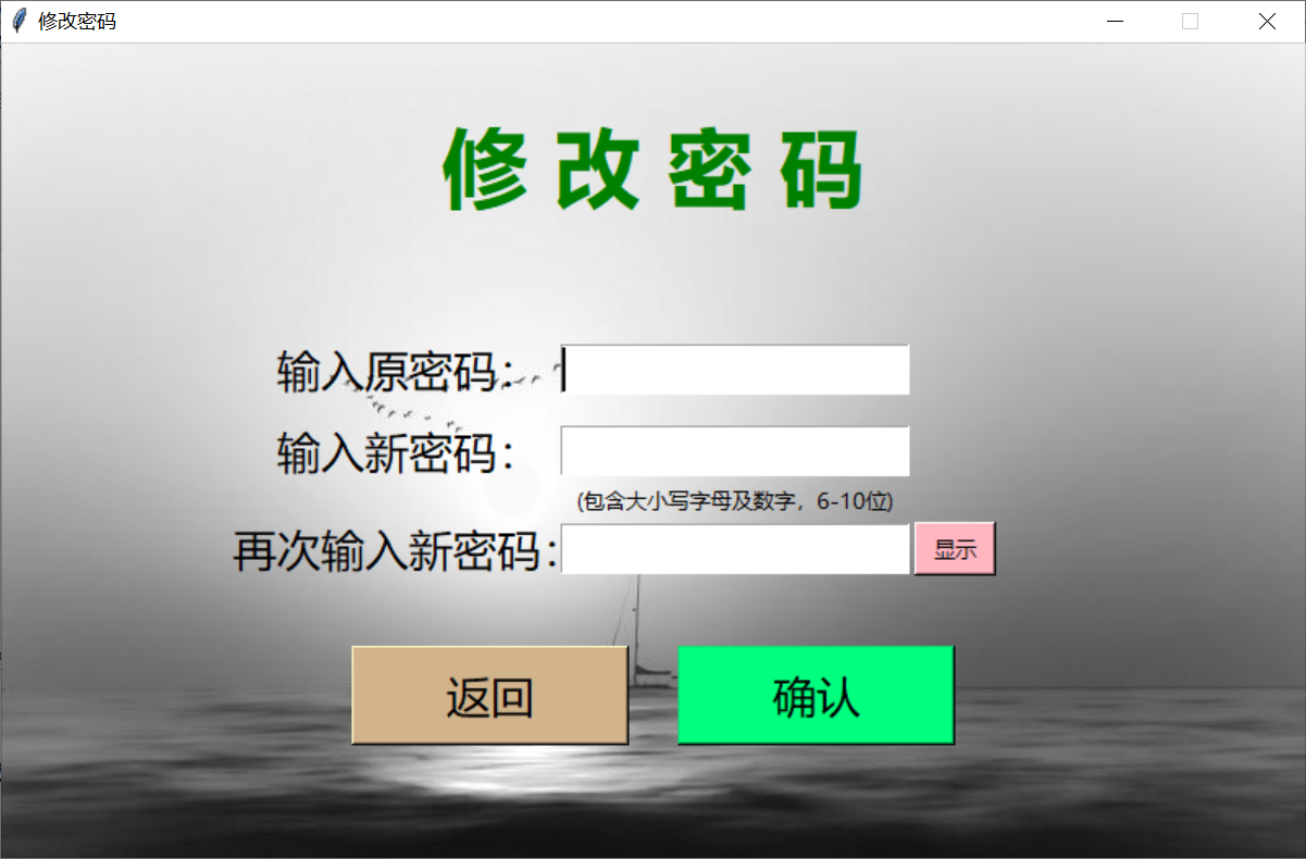 def show_change(self): if self.pwd_entry['show'] == '*': self.pwd_entry['show'] = '' self.pwd_again_entry['show'] = '' self.show_button['text'] = '不显示' else: self.pwd_entry['show'] = '*' self.pwd_again_entry['show'] = '*' self.show_button['text'] = '显示' def check_pwd(self, unused_ev=None): pwd = self.pwd_entry.get() pwd_again = self.pwd_again_entry.get() compile_pwd = re.compile('^(?=.*[0-9].*)(?=.*[A-Z].*)' '(?=.*[a-z].*).{6,10}$') if compile_pwd.match(pwd): if pwd == pwd_again: um.user_new(self.user_id, pwd) messagebox.showinfo(title='注册成功', message='用户%s,您已经成功注册!' % self.user_id) LogIn(self.window) else: self.canvas.itemconfig(self.tip_label, text='两次输入密码不一致!') self.pwd_again_entry.delete(0, tk.END) self.pwd_again_entry.focus_set() else: self.canvas.itemconfig(self.tip_label, text='密码格式不正确!') self.pwd_entry.delete(0, tk.END) self.pwd_again_entry.delete(0, tk.END) self.pwd_entry.focus_set()