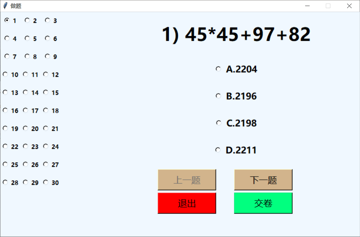 class Test: """ 做题模块 """ test_list = [] # 传来的题目 def __init__(self, parent_window, user_id, study_level, test_number): self.user_id = user_id self.study_level = study_level self.test_number = test_number # 题目数量 self.test_list = nt.new_test(self.study_level, self.test_number) self.select_list = [0]*test_number # 选择的答案列表,开始全为0 self.window = parent_window self.window.title('做题') self.frame = tk.Frame(self.window, bg='aliceblue') self.frame.place(x=0, y=0, width=800, height=500) self.frame.focus_set() test_select_frame = tk.Frame(self.frame, bg='aliceblue') test_select_frame.place(x=0, y=0, width=200, height=500) self.show_label = tk.Label(test_select_frame, text='', font=('宋体', 20, 'bold'), fg='red', bg='aliceblue',) self.show_label.place(x=0, y=450, width=200, height=100, anchor=tk.W) self.test_var = tk.IntVar() # 选择题目 self.test_button_list = [] for i in range(0, self.test_number): # value=i,但显示题目要i+1,下标从零开始 test_button = tk.Radiobutton(test_select_frame, text=str(i+1), font=('微软雅黑', 10, 'bold'), bg='aliceblue', variable=self.test_var, value=i, command=self.select_dis) test_button.grid(row=i//3, column=i-(i//3)*3, pady=5) self.test_button_list.append(test_button) self.test_var.set(0) test_frame = tk.Frame(self.frame, bg='aliceblue') test_frame.place(x=200, y=0, width=650, height=400) self.test_label = tk.Label(test_frame, text='1) '+self.test_list[0][0], font=('微软雅黑', 30, 'bold'), fg='black', bg='aliceblue') self.test_label.pack(pady=20) self.option_var = tk.IntVar() self.a_rd = tk.Radiobutton(test_frame, text="A." + str(self.test_list[0][2][0]), font=('微软雅黑', 15, 'bold'), bg='aliceblue', command=self.option_dis, variable=self.option_var, value=1) self.a_rd.pack(pady=10) self.b_rd = tk.Radiobutton(test_frame, text="B." + str(self.test_list[0][2][1]), font=('微软雅黑', 15, 'bold'), bg='aliceblue', command=self.option_dis, variable=self.option_var, value=2) self.b_rd.pack(pady=10) self.c_rd = tk.Radiobutton(test_frame, text="C." + str(self.test_list[0][2][2]), font=('微软雅黑', 15, 'bold'), bg='aliceblue', command=self.option_dis, variable=self.option_var, value=3) self.c_rd.pack(pady=10) self.d_rd = tk.Radiobutton(test_frame, text="D." + str(self.test_list[0][2][3]), font=('微软雅黑', 15, 'bold'), bg='aliceblue', command=self.option_dis, variable=self.option_var, value=4) self.d_rd.pack(pady=10) self.option_var.set(0) button_frame = tk.Frame(self.frame, bg='aliceblue') button_frame.place(x=350, y=350, width=450, height=100) self.last_button = tk.Button(button_frame, text="上一题", font=('微软雅黑', 15), width=10, height=1, fg='black', bg='tan', command=self.last_test, state='disable', activebackground='pink', activeforeground='black') self.last_button.grid(row=0, column=1, sticky=tk.E) self.next_button = tk.Button(button_frame, text="下一题", font=('微软雅黑', 15), width=10, height=1, fg='black', bg='tan', command=self.next_test, activebackground='pink', activeforeground='black') self.next_button.grid(row=0, column=2, padx=40, sticky=tk.W) return_button = tk.Button(button_frame, text="退出", font=('微软雅黑', 15), width=10, height=1, command=lambda: LogIn(self.window), fg='black', bg='red', activebackground='pink', activeforeground='black') return_button.grid(row=1, column=1, pady=5, sticky=tk.E) self.commit_button = tk.Button(button_frame, text="交卷", font=('微软雅黑', 15), width=10, height=1, command=self.commit_message, fg='black', bg='springgreen', activebackground='pink', activeforeground='black') self.commit_button.grid(row=1, column=2, padx=40, pady=5, sticky=tk.W) self.window.bind("<Return>", self.commit_message) # 绑定响应 self.window.mainloop()