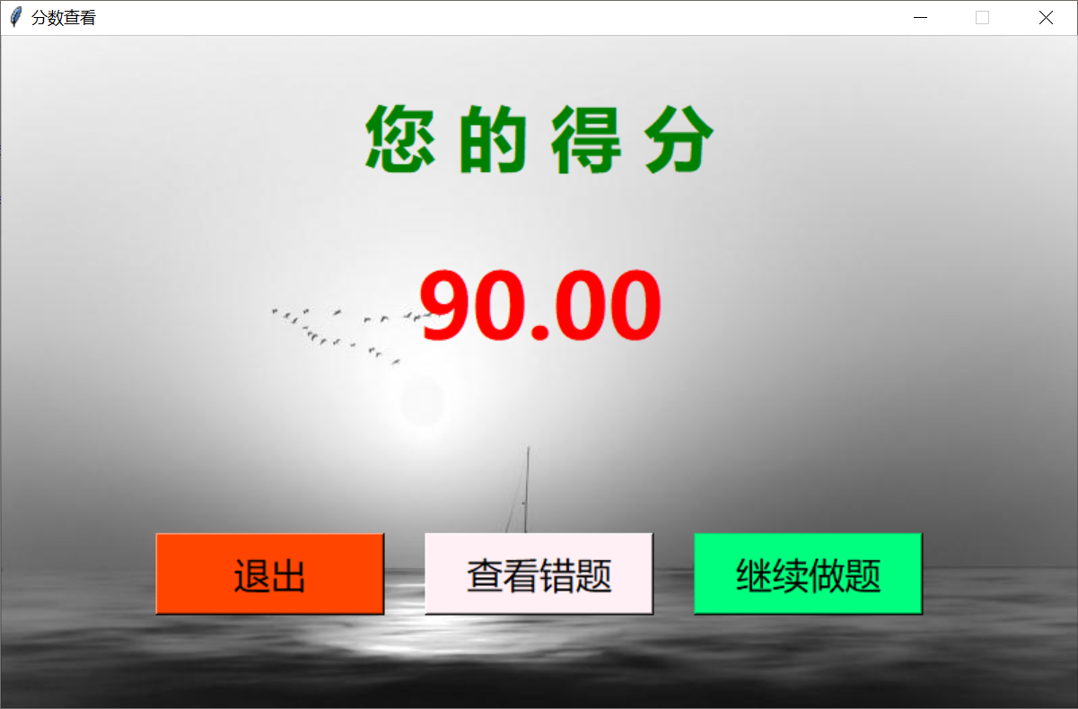class Score: """ 得分页面 """ def __init__(self, parent_window, user_id, test_list, select_list, study_level): self.user_id = user_id self.test_list = test_list self.select_list = select_list self.study_level = study_level self.window = parent_window self.window.title('分数查看') self.frame = tk.Frame(self.window) self.frame.place(x=0, y=0, width=800, height=500) self.frame.focus_set() self.bg_photo = tk.PhotoImage(file=PHOTO_PATH) self.canvas = tk.Canvas(self.frame, width=800, height=500, highlightthickness=0, borderwidth=0) self.canvas.place(x=0, y=0) self.canvas.create_image(0, 0, anchor='nw', image=self.bg_photo) self.canvas.create_text(400, 75, text='您 的 得 分', font=('微软雅黑', 40, 'bold'), fill='green') true_number = 0 for i in range(0, len(self.select_list)): if self.select_list[i] == self.test_list[i][1]: true_number += 1 score = (true_number / len(test_list)) * 100 score = '%.2f' % score self.canvas.create_text(400, 200, text=score, font=('微软雅黑', 50, 'bold'), fill='red') return_button = tk.Button(self.frame, text="退出", font=('微软雅黑', 20), width=10, height=1, command=lambda: LogIn(self.window), fg='black', bg='orangered', activebackground='pink', activeforeground='black') return_button.place(x=200, y=400, anchor=tk.CENTER) check_button = tk.Button(self.frame, text="查看错题", font=('微软雅黑', 20), width=10, height=1, fg='black', bg='LavenderBlush', command=self.check_wrong, activebackground='pink', activeforeground='black') check_button.place(x=400, y=400, anchor=tk.CENTER) continue_button = tk.Button(self.frame, text="继续做题", font=('微软雅黑', 20), width=10, height=1, fg='black', bg='springgreen', command=self.continue_test, activebackground='pink', activeforeground='black') continue_button.place(x=600, y=400, anchor=tk.CENTER) self.window.mainloop()