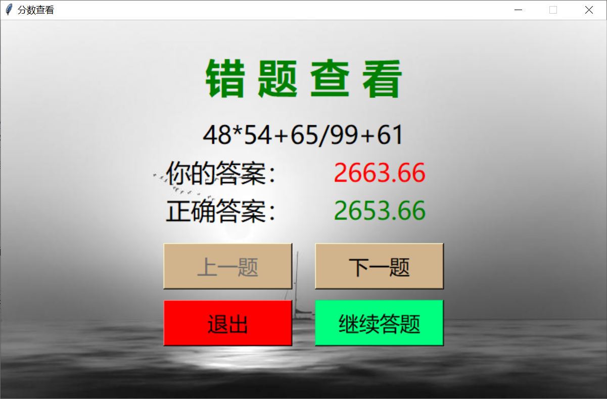 class CheckWrong: """ 错题页面 """ def __init__(self, parent_window, user_id, wrong_test_list, study_level): self.user_id = user_id self.wrong_test_list = wrong_test_list self.study_level = study_level self.window = parent_window self.window.title('分数查看') self.frame = tk.Frame(self.window) self.frame.place(x=0, y=0, width=800, height=500) self.frame.focus_set() self.bg_photo = tk.PhotoImage(file=PHOTO_PATH) self.canvas = tk.Canvas(self.frame, width=800, height=500, highlightthickness=0, borderwidth=0) self.canvas.place(x=0, y=0) self.canvas.create_image(0, 0, anchor='nw', image=self.bg_photo) self.position = 0 self.canvas.create_text(400, 75, text='错 题 查 看', font=('微软雅黑', 40, 'bold'), fill='green') self.test = self.canvas.create_text( 400, 150, text=self.wrong_test_list[0][0], font=('微软雅黑', 25)) self.canvas.create_text(300, 200, text='你的答案:', font=('微软雅黑', 25)) self.own_answer = self.canvas.create_text( 500, 200, text=self.wrong_test_list[0][1], font=('微软雅黑', 25), fill='red') self.canvas.create_text(300, 250, text='正确答案:', font=('微软雅黑', 25)) self.true_answer = self.canvas.create_text( 500, 250, text=self.wrong_test_list[0][2], font=('微软雅黑', 25), fill='green') self.last_button = tk.Button(self.frame, text="上一题", font=('微软雅黑', 20), width=10, height=1, fg='black', bg='tan', command=self.last_test, activebackground='pink', activeforeground='black', state='disable') self.last_button.place(x=300, y=325, anchor=tk.CENTER) self.next_button = tk.Button(self.frame, text="下一题", font=('微软雅黑', 20), width=10, height=1, fg='black', bg='tan', command=self.next_test, activebackground='pink', activeforeground='black') self.next_button.place(x=500, y=325, anchor=tk.CENTER) return_button = tk.Button(self.frame, text="退出", font=('微软雅黑', 20), width=10, height=1, command=lambda: LogIn(self.window), fg='black', bg='red', activebackground='pink', activeforeground='black') return_button.place(x=300, y=400, anchor=tk.CENTER) confirm_button = tk.Button(self.frame, text="继续答题", font=('微软雅黑', 20), width=10, height=1, fg='black', bg='springgreen', command=self.continue_test, activebackground='pink', activeforeground='black') confirm_button.place(x=500, y=400, anchor=tk.CENTER) self.window.mainloop()
