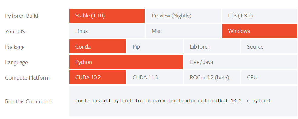 选择相关参数,如果电脑没有Nvidia显卡或者只有集显,CUDA 选择 CPU 即可。然后运行下面的指令。 -
