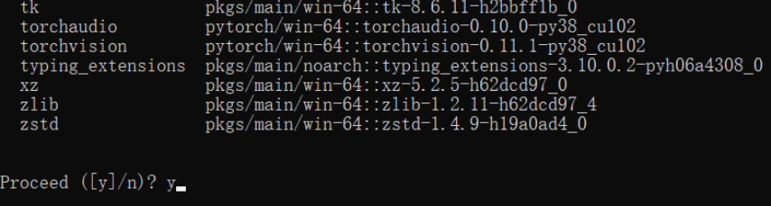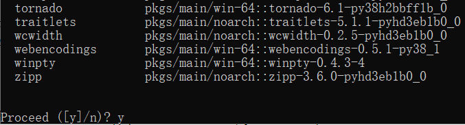 输入 y 开始安装需要的包并创建环境(如果出现了 ERROR 并且你此时正在使用代理,尝试关闭代理)。