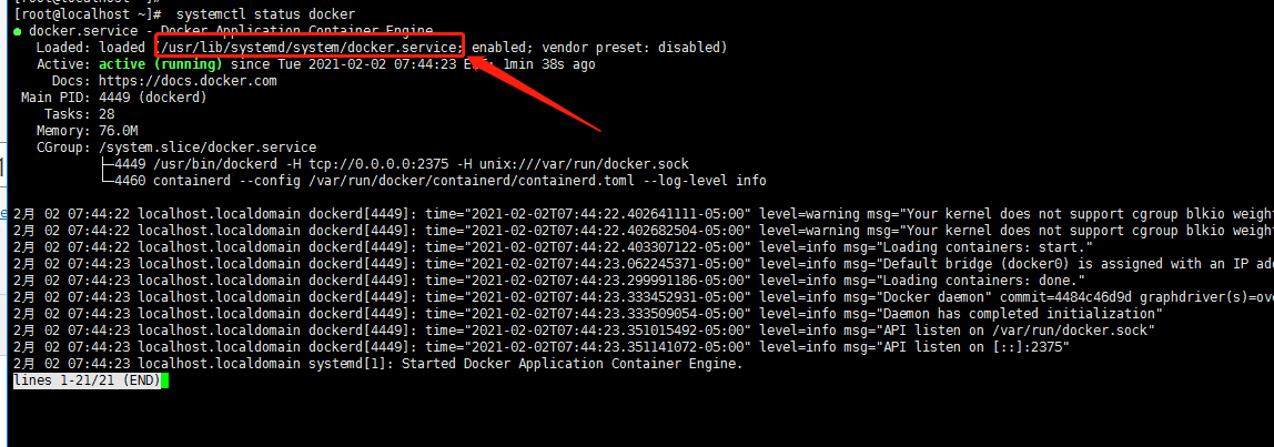 [root@localhost ~]# netstat -nltp |grep 2375 tcp6 0 0 :::2375 :::* LISTEN 4449/dockerd [root@localhost ~]#
