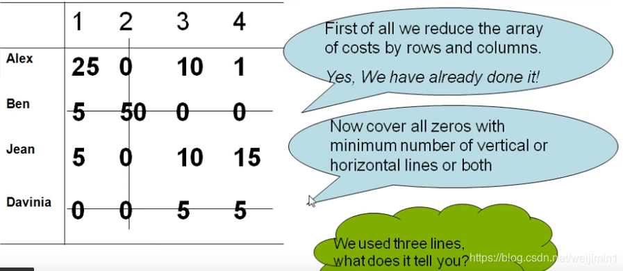 步骤三:用最少的行线和列线将新矩阵中的零全部穿起来,检查目前是否为最优分配。如果行线和列线没有将矩阵所有元素都穿起来,进入第四步,否则则进入步骤五