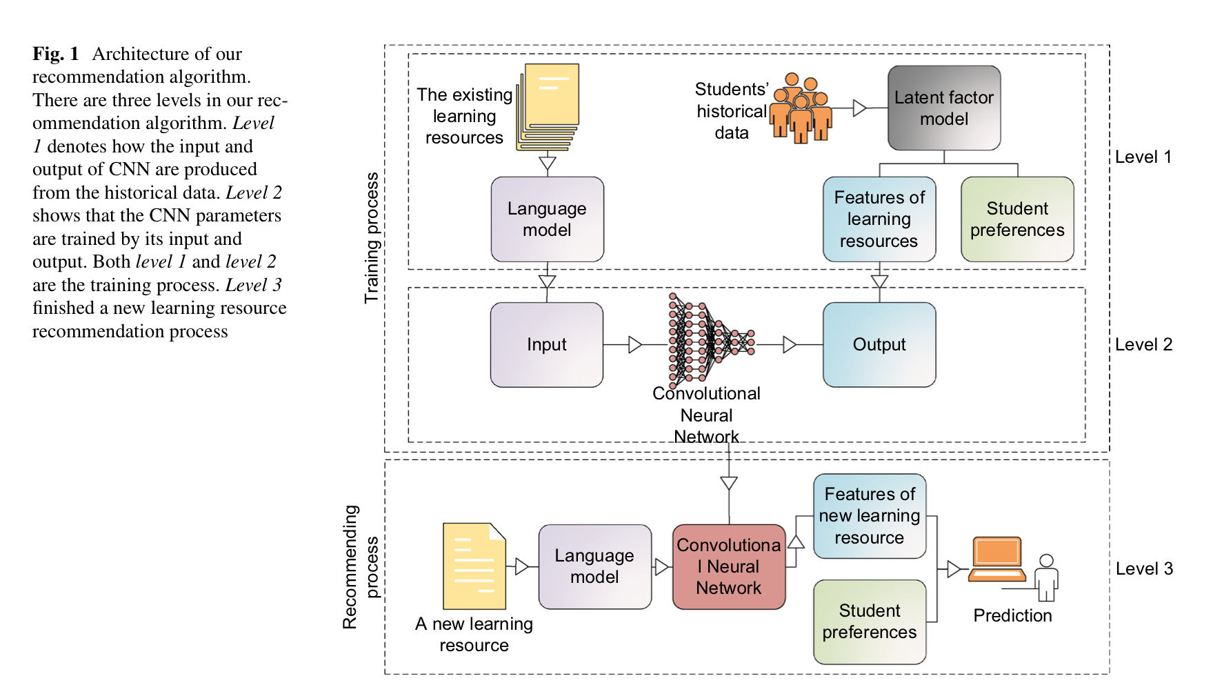 Recommending e-learning related resources is becoming increasingly important due to higher demands of online learning systems. This paper proposes a novel text-based recommendation algorithm for those resources which is built with CNN and Latent factor model. In this model, CNN is used to predict students’ preferences towards different features of resources from their text contents, and predict students’ ratings for those resources by LFM. Experiments have shown that by applying this model, there is a noticeable improvement compared to state-of-the-art methods, in aspects of accuracy, sparseness and training cost; also, this model can also be applied to other fields such as movies or TV programs, not limited to learning resources.