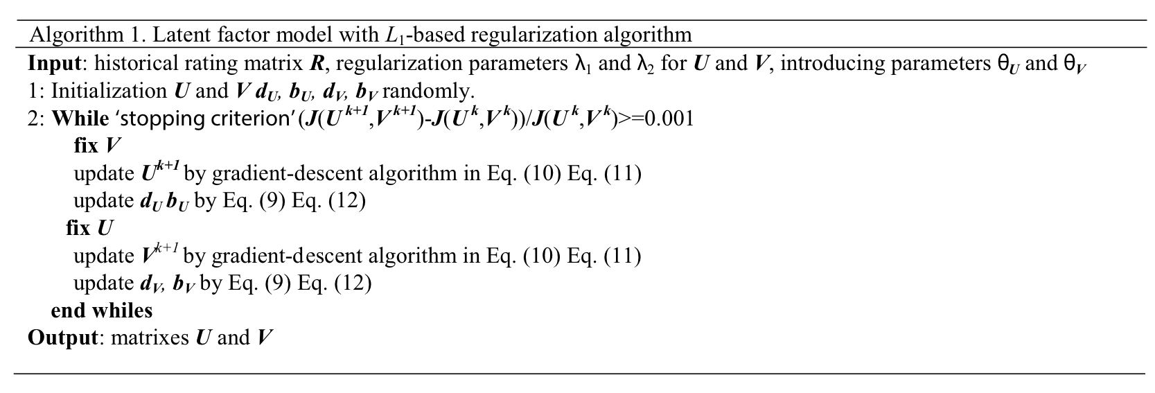 具体到细节,CNN的结构比较常见,因此也不做过多介绍;LFM因为R矩阵比较稀疏,因此采用L1 norm去作为限制条件进行优化,使用split Bregman iteration method 来进行学习。算法如下图所示。