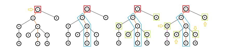 我们先给重链自顶向下标号,然后自底向上给轻儿子标号,一个点的轻儿子编号完成后直接递归处理。这样可以保证除了子树根节点,其他点编号连续。