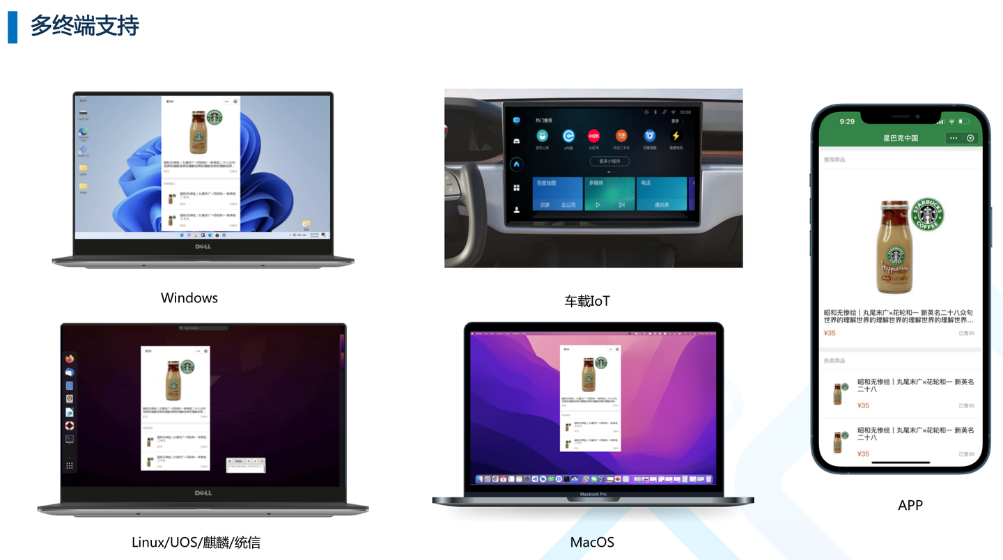 软件一端上架,多终端运行。FinClip 支持手机以外的多种终端,包括 Linux、Windows、MacOS、麒麟等操作系统。这意味着,PC 端、车载设备、智能电视都能使用小程序了,实现了小程序的“一次开发,到处运行”,同时触达众多流量平台,而不仅仅局限于微信生态。