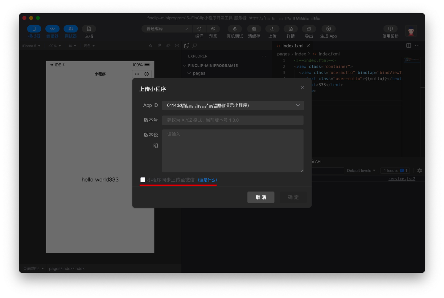随后,使用 FinClip 开发者工具打开对应小程序,在确认小程序代码开发无误后,可以点击 IDE 界面中的「上传」按钮,并勾选下方的「小程序同步上传至微信」复选框。
