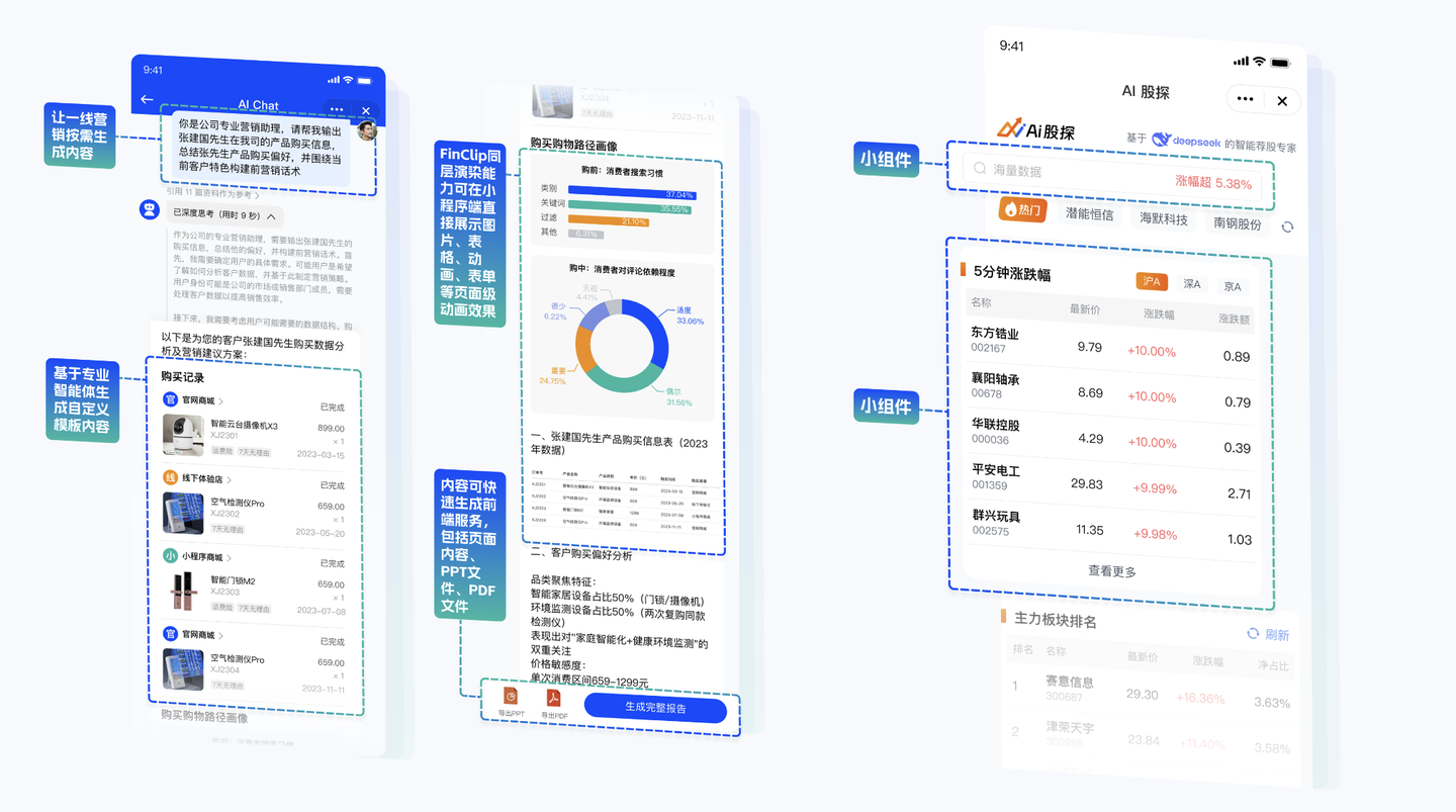 2、AI生成+一键转换的“组合拳” FinClip新推出的AI框架更是个“骚操作”。开发者用自然语言描述需求,AI自动生成小程序代码,再通过IDE工具一键转成APP。整个过程比点外卖还简单:输入“我要个带会员系统的电商APP”,AI生成小程序代码,云端打包成APP安装包。这种“AI画图,FinClip打印”的玩法,直接把开发效率拉到满格。
