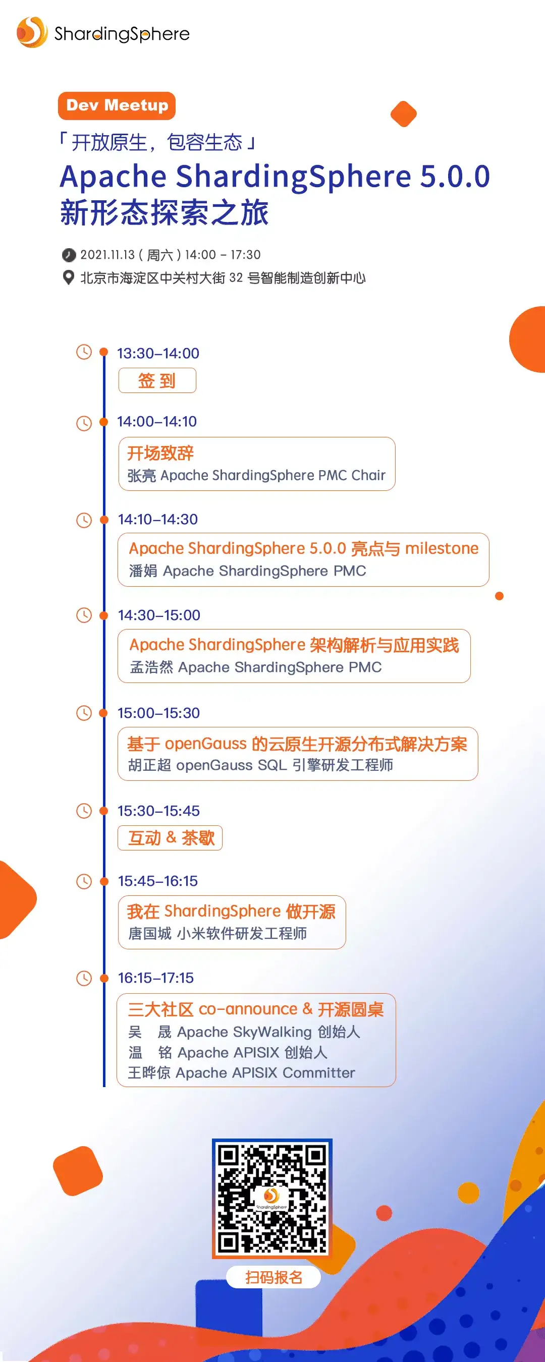 11 月 13 日,由 Apache ShardingSphere 社区主办的【Apache ShardingSphere Dev Meetup】将在北京市海淀区中关村大街 32 号智能制造创新中心 1 楼多功能厅举行。本次活动以【开放原生,包容生态 | Apache ShardingSphere 新形态探索之旅】为主题,聚焦即将发布的 Apache ShardingSphere 5.0.0 正式版本,从新功能特性、社区建设、技术合作、生态共建等多个角度,探索开源社区治理的新形态。