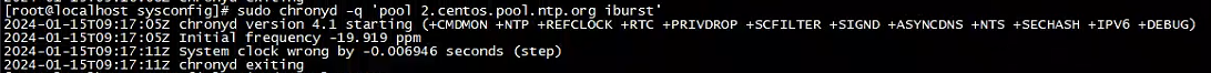 2、[root@localhost sysconfig]# sudo chronyd -q 'pool 2.centos.pool.ntp.org iburst'