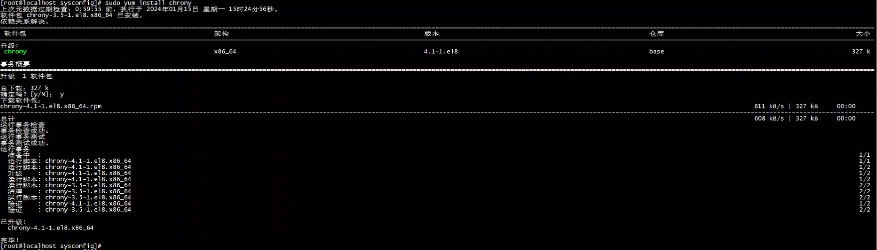 我这里通过安装 chrony 来进行时间同步。使用以下命令: