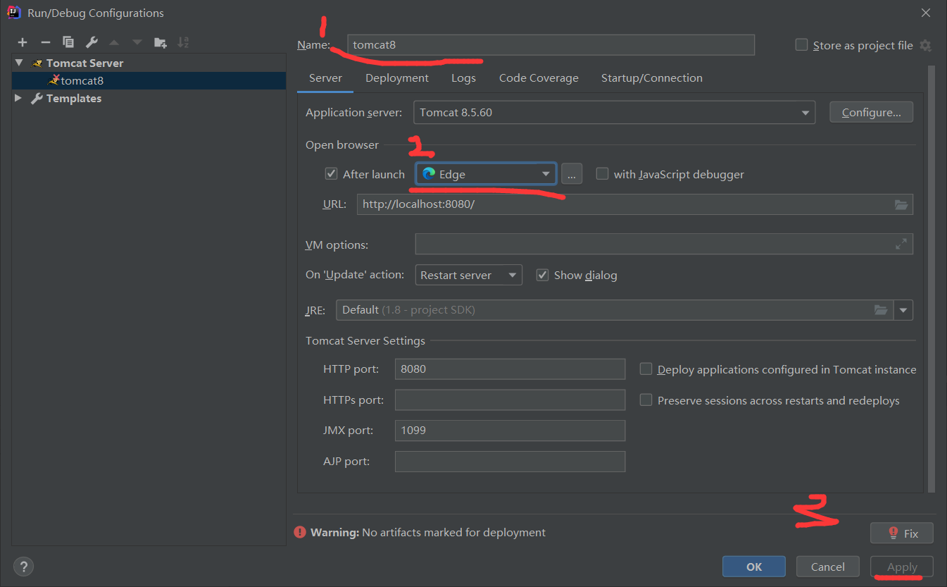 1-名字 我用的是tomcat8 2-修改默认启动tomcat的浏览器 3-点击应用