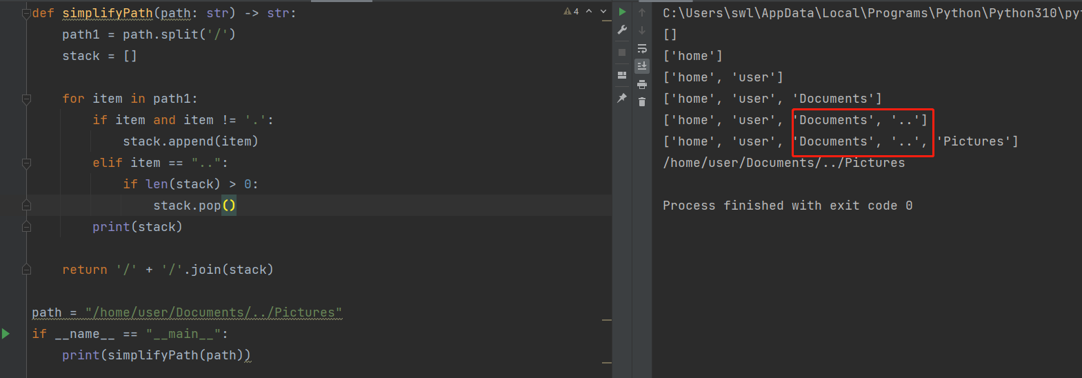 def simplifyPath(path: str) -> str: path1 = path.split('/') stack = [] for item in path1: if item and item != '.': stack.append(item) elif item == "..": if len(stack) > 0: stack.pop() print(stack) return '/' + '/'.join(stack)