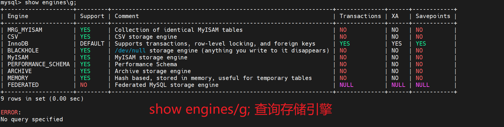 1、show engines\g; 来查询当前数据库使用的存储引擎。