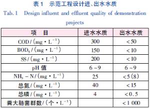 本示范工程规模为50 m3/d,占地面积为300m2,工程纳污户数150户,总人数为450人,污水主要来源是居民厨房污水、浴室洗澡污水及其他公共场所的冲厕污水等。