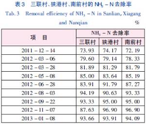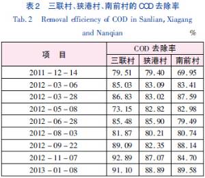 通过实验方法分别测得三联村、狭港村和南前村的进、出水COD值,并计算得出各村的COD去除率,如表2所示。