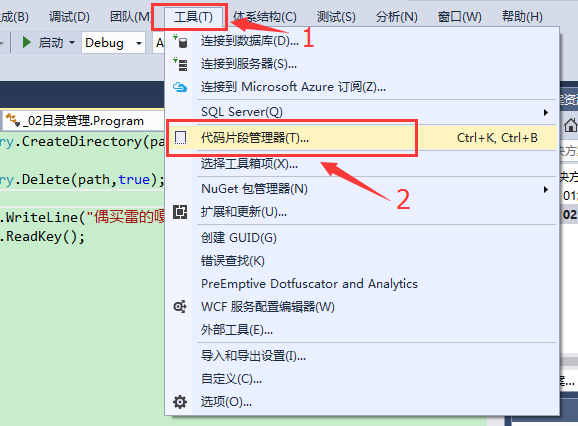 代码段管理器可以在“工具”菜单里打开(Ctrl+K,Ctrk+B)。
