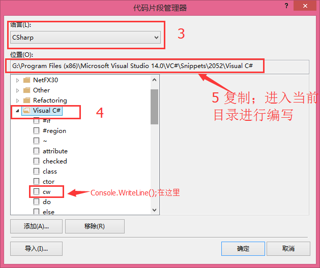 工具→代码片段管理器→语言:CSharp→Visual C#→复制位置路径→编写代码片段→保存后重启VS。