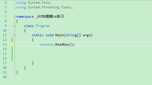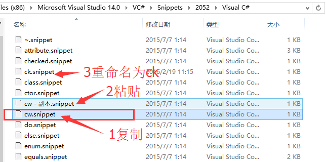 打开资源管理器,将复制的路径粘贴,到达代码片段的根目录,目录中已有cw的快捷键,此次自定义的是"Console.ReadKey();",和cw类似,所以将cw复制粘贴,重命名为ck。