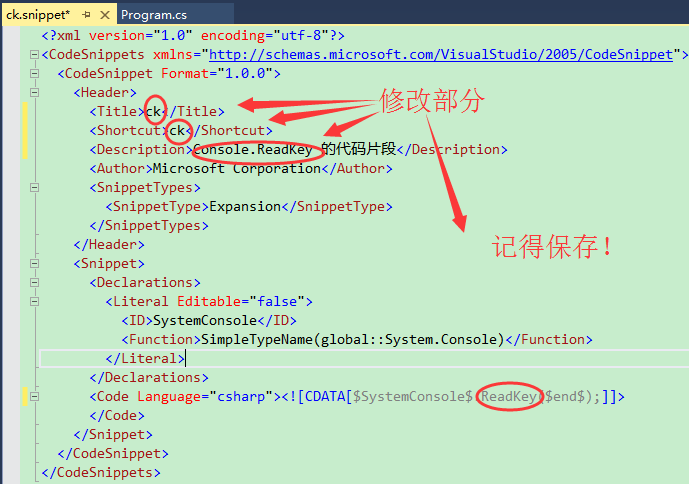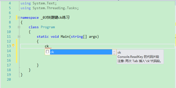 5、保存后,重启VS,键入ck,双击Tab即可。