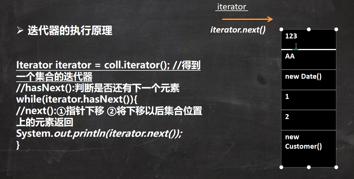 - 所有实现了Collection接口的集合类都有一个iterator()方法,用以返回一个实现了Iterator接口的对象,即可以返回一个迭代器