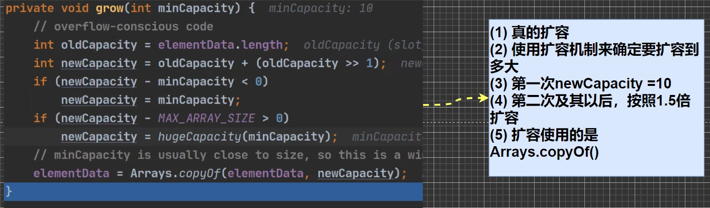 | ArrayList | 可变数组 | JDK1.2 | 不安全,效率高 | 如果是有参构造,则是按照给的大小扩容1.5倍;如果是无参构造,第一次为10,第二次为1.5倍 |