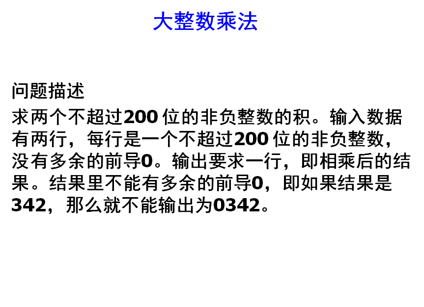 (1)在程序中,用unsigned an1[200]和unsigned an2[200]分别存放两个乘数,用aResult[400]来存放积。计算的中间结果也都存在aResult中。aResult长度取400是因为两个200 位的数相乘,积最多会有400 位。an1[0], an2[0], aResult[0]都表示个位。