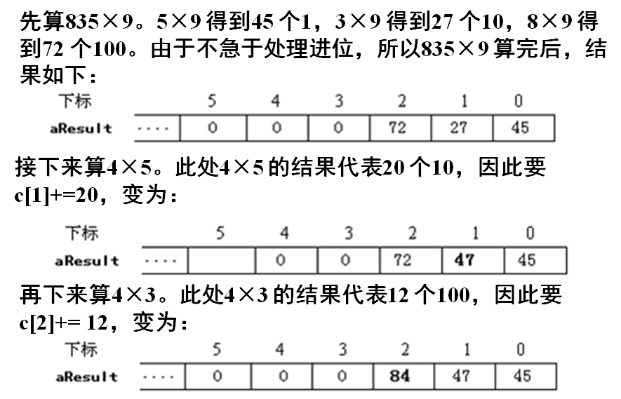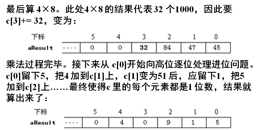(2)计算的过程基本上和小学生列竖式做乘法相同。为编程方便,并不急于处理进位,而将进位问题留待最后统一处理。