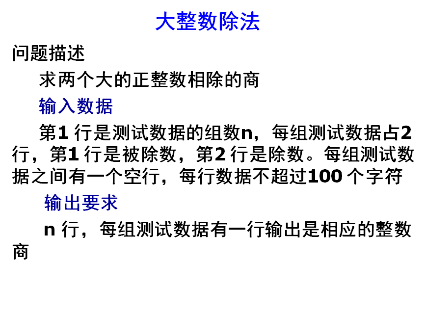 故核心是要写一个大整数的减法函数,然后反复调用该函数进行减法操作。 计算除数的10 倍、100 倍的时候,不用做乘法,直接在除数后面补0 即可。